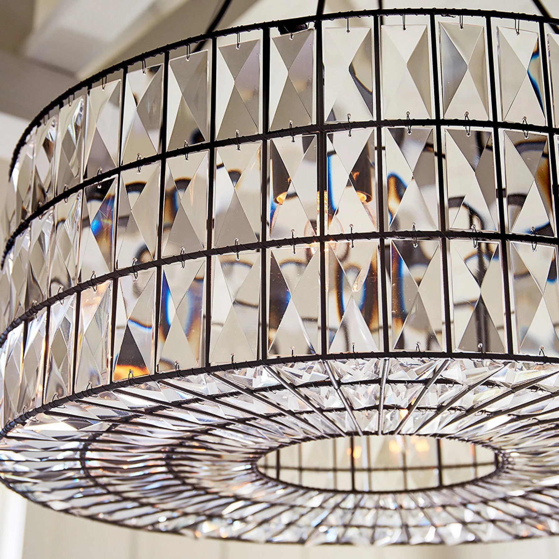Designed with an iron frame surrounded by shimmering rectangular-faceted crystals