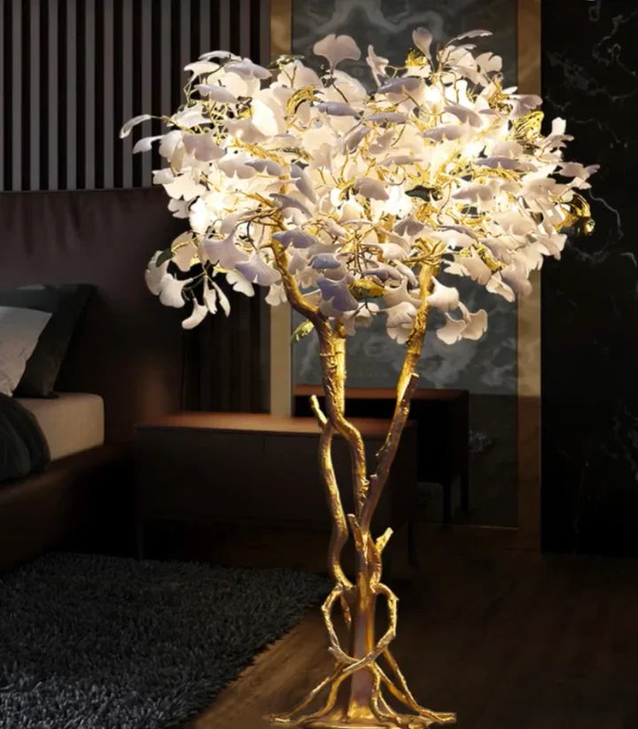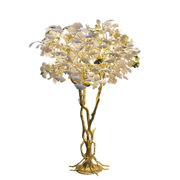 This artistic floor lamp is like a dazzling lush ginkgo tree, using ceramic production simulation ginkgo leaves, white ginkgo leaves and golden copper branches complement each other, the special thing about this lamp is that the simulation leaves are also dotted with a little gold leaves, so that this lamp is no longer monotonous, this decorative floor lamp is particularly suitable for decorating the home or coffee shops, bars and other places to illuminate the place while creating a romantic atmosphere.