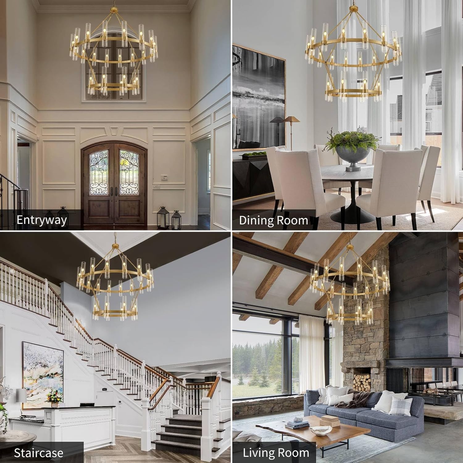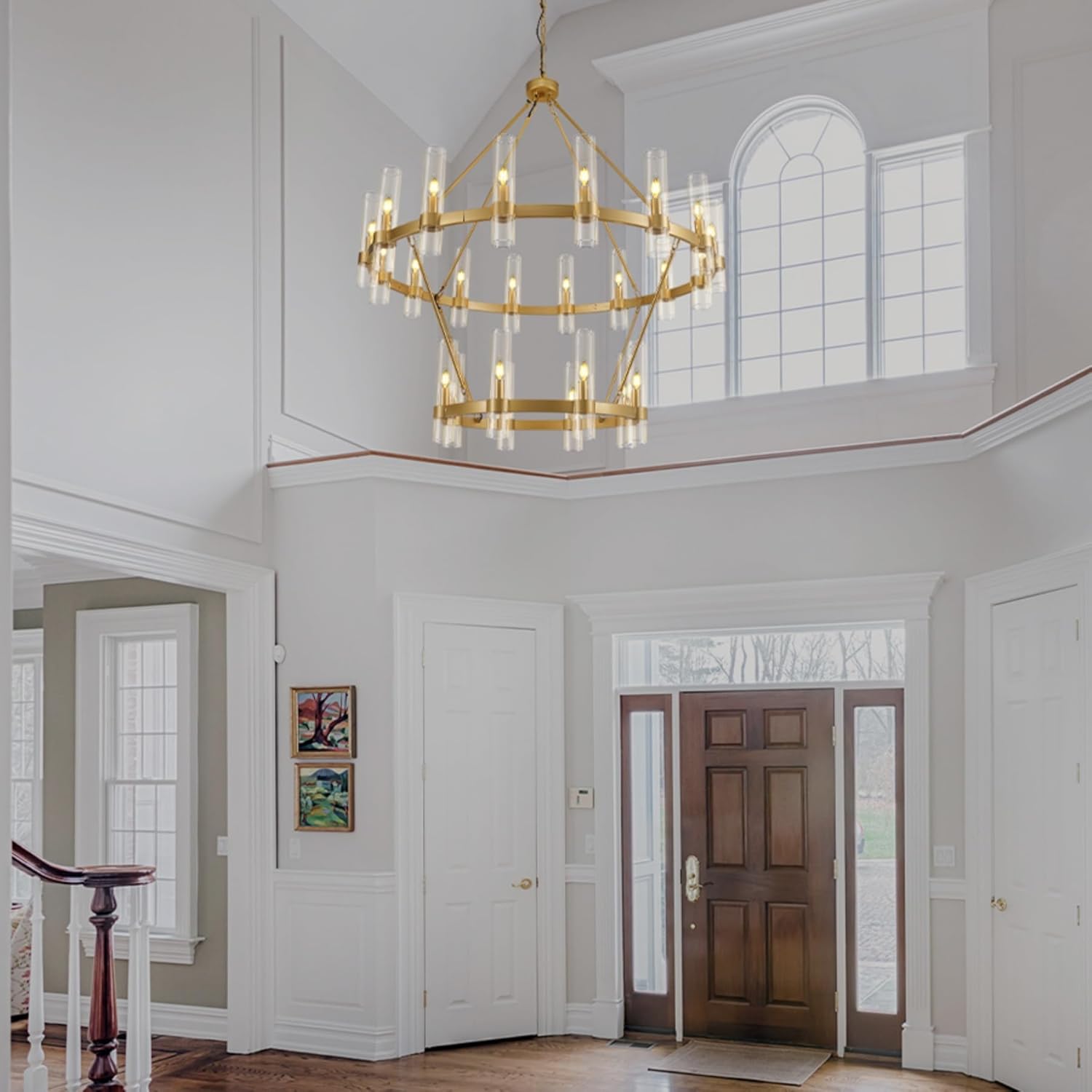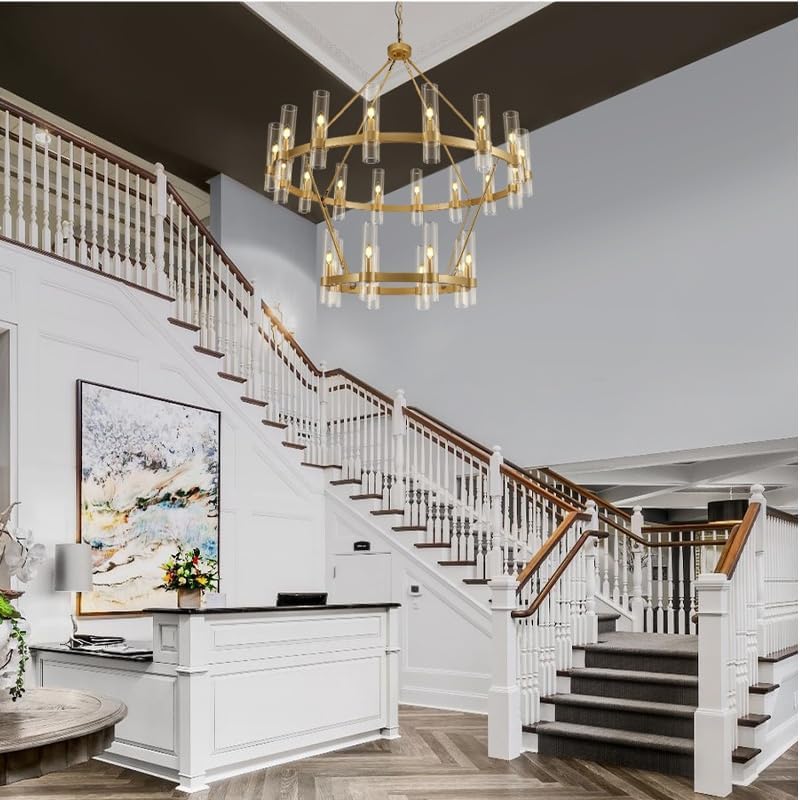 Besides the general rule that the chandelier’s bottom should be at least 7 and a half feet away from the floor. For two stories, what you also need to consider is how will it look from the second floor. In general, staircase chandeliers will be a good choice for space. In term of placing, below are two commonly seen guidance: